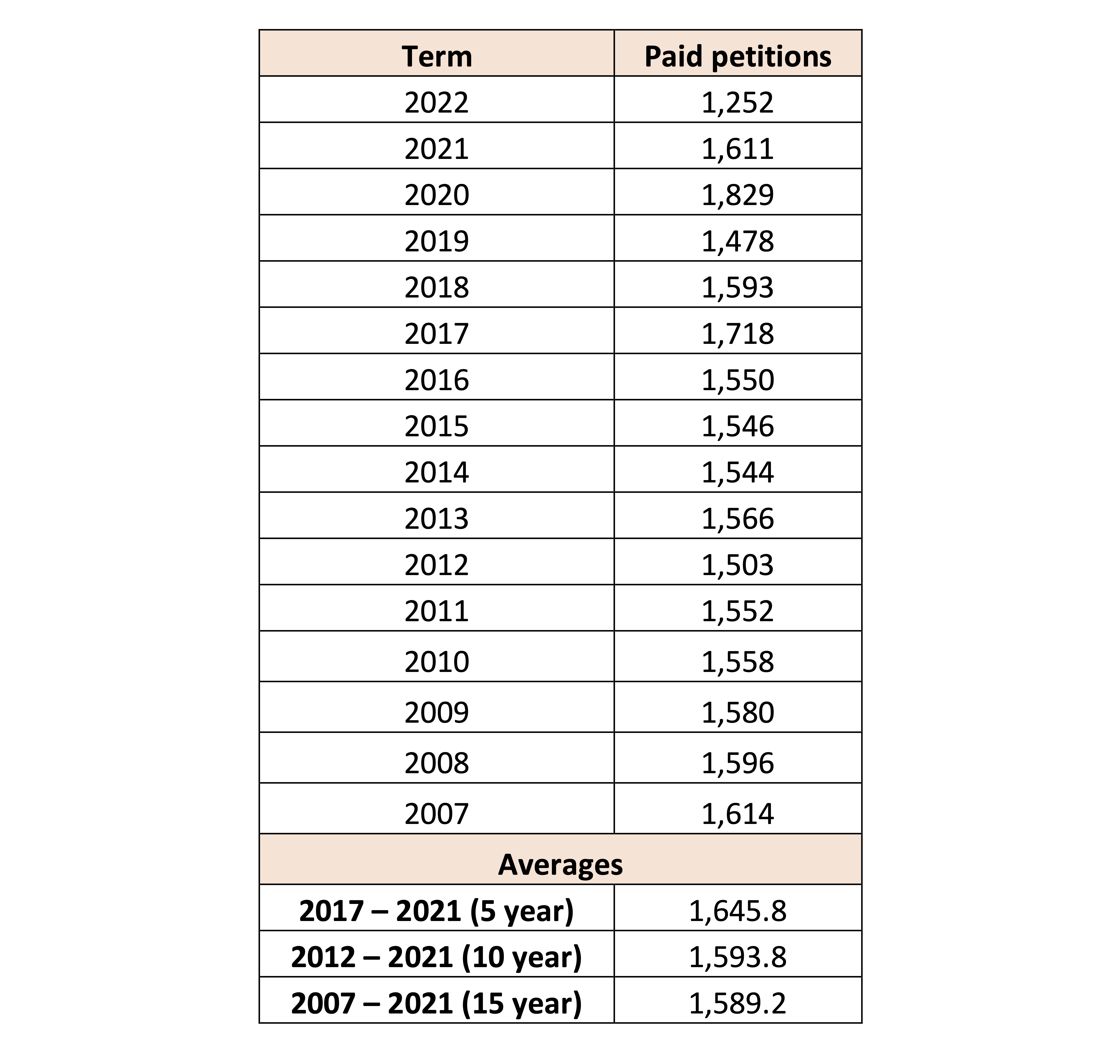 This year’s decline is substantial: a 21.2 percent decrease from the previous 15-year average, and a 23.9 percent decrease from the previous five-year average. Even compared with the 2019-20 term’s 1,478 petitions, it marks a more than 15 percent decrease. Or think about it this way — paid petition 1,252 was docketed on June 30 this year but was docketed on the following dates in the previous five terms: March 16, 2022, March 10, 2021, April 28, 2020 (at the height of the pandemic), March 29, 2019, and March 8, 2018.