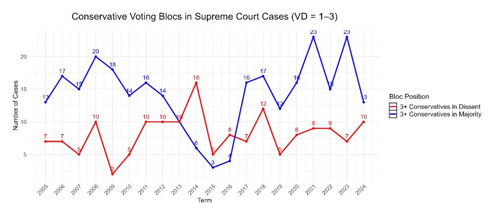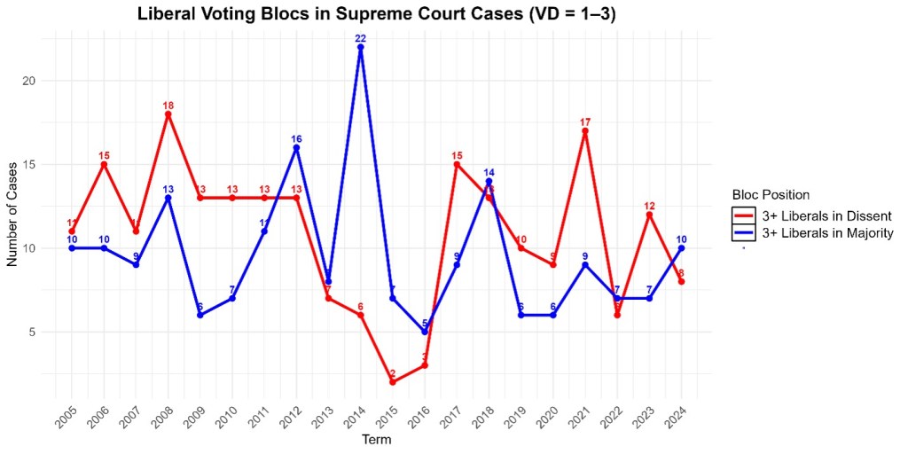 Liberal blocs were more often in the majority before 2018. Since then, they’ve been concentrated in dissent until the 2024-25 term, when the liberal bloc rebounded with 10 majorities in such cases and eight dissents.