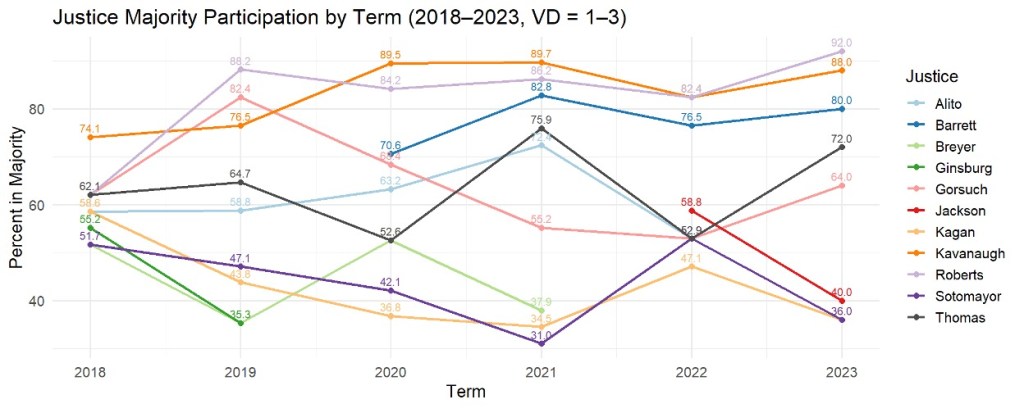 This trend is borne out statistically. As shown above, Roberts, Kavanaugh, and Barrett have consistently appeared in the majority in closely divided cases since 2018. In the 2024 term, Roberts was in the majority 90% of the time in VD 1-3 cases, Kavanaugh was in the majority 80% of the time, and Barrett was in the majority 70% of the time.