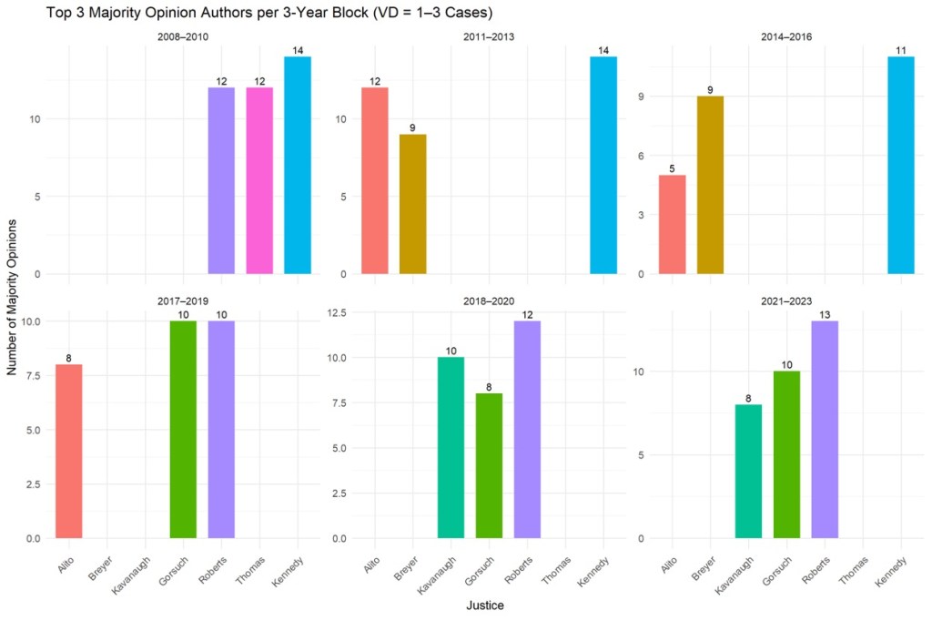 During the 2024-25 term, Roberts authored the most VD 1-3 majority opinions with four, while Gorsuch and Alito came next with three apiece. Barrett continued to develop a reputation for doctrinal clarity and coalition stability, authoring one of the most high-profile decisions of the term in Trump v. CASA. Meanwhile, Kavanaugh emerged as a central coalition writer, authoring more 6-3 majority opinions this past term than any other justice.