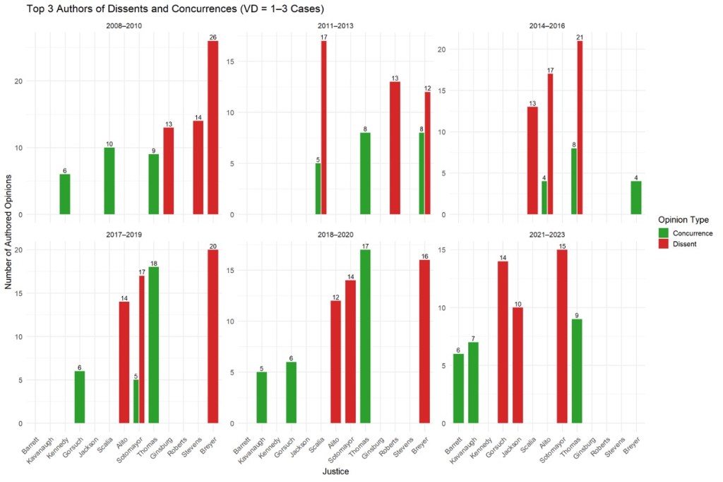 In the 2024-25 term, Thomas authored concurrences in five VD 1-3 decisions and dissented in seven. Justice Elena Kagan, Sotomayor, and Jackson all authored four dissents in VD 1-3 decisions, while Alito, Barrett, Kavanaugh, and Jackson all authored two concurrences in this set of decisions.