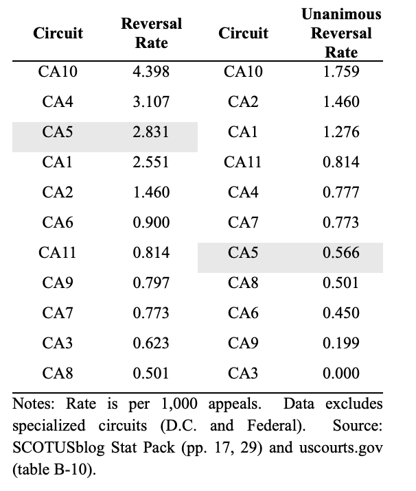 Finally, a circuit’s win-loss record ignores that some circuits like the 5th decide many more appeals than other circuits. This obviously gives the Supreme Court many more chances to reverse it than other circuits.