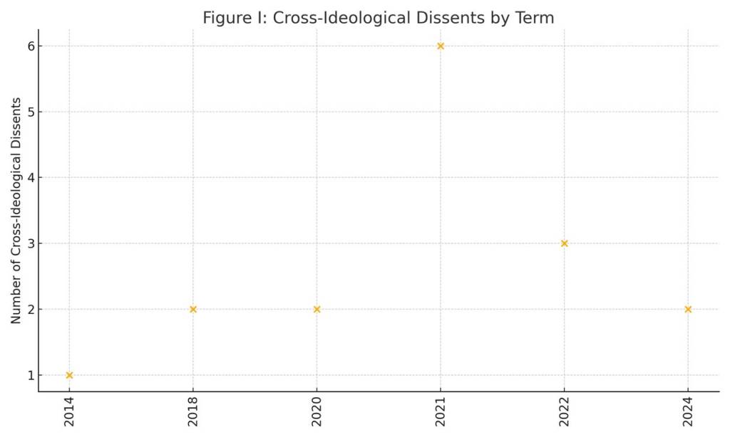 Cross-ideological dissents – at least one conservative and one liberal dissenting together – are rare but perhaps more revealing. There are 16 instances of these, about 4% of all dissents, in the time period studied. They cluster in a few standout terms, notably the 2020-21 term, and often feature Roberts or Gorsuch dissenting alongside the liberals (Breyer, Kagan, Sotomayor, and later Jackson).