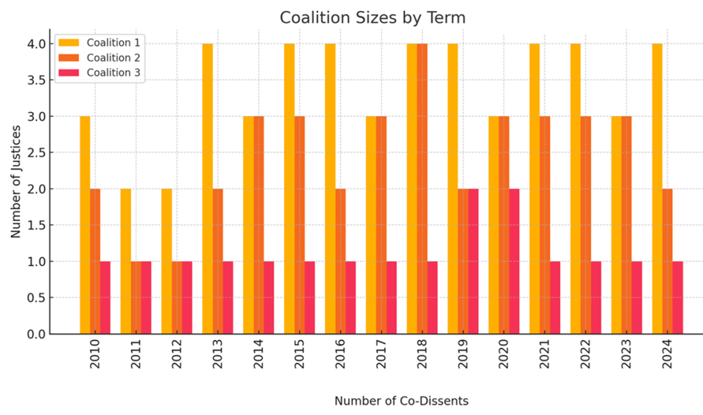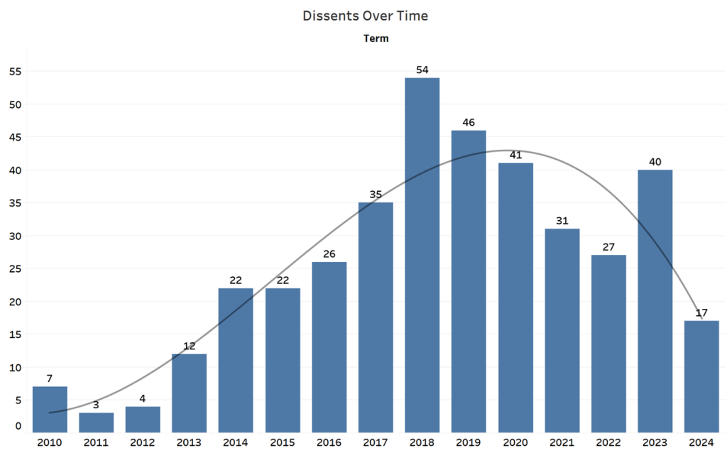 Dissents surge and then cool. In 2010, we see few dissents, likely reflecting the court’s spare use of the shadow docket for important decisions. Dissents notably increase in the 2014-15 term (a year before Baude’s article bringing the shadow docket to light), and then hit a high-water mark in the 2018-19 term with 54 dissents. This is followed by elevated levels through the 2020-21 term before curiously dropping and then rising again in the 2023-24 term.