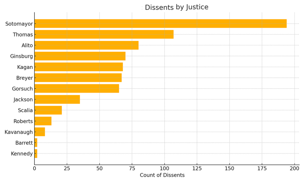 The poles are familiar. Sotomayor is the era’s dominant dissenter (194). On the right, Justices Clarence Thomas (107) and Samuel Alito (80) lead, with Justice Neil Gorsuch (65) following. Earlier liberal totals are driven by Justices Ruth Bader Ginsburg (70), Elena Kagan (68), and Stephen Breyer (67); Justice Ketanji Brown Jackson (35) rises quickly in later years.