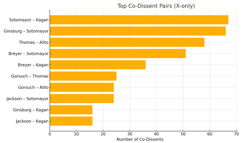 Seeing what justices co-dissented confirms this. The most frequent co-dissents are by Sotomayor–Kagan (67) and Ginsburg–Sotomayor (66) on the left and Thomas–Alito (58) on the right. Breyer–Sotomayor (51) and Breyer–Kagan (36) also commonly co-dissented.