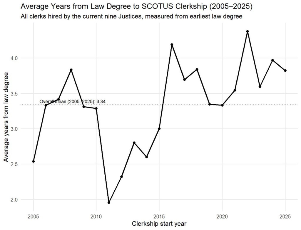 One of the more notable shifts is how long it now takes between graduating from law school and a Supreme Court clerkship. This timeline has lengthened considerably. In the mid-2000s, new Supreme Court clerks typically arrived about 2.5 years after law school; 20 years later, the average is closer to 3.8 years. This pattern reflects two shifts: candidates increasingly add a second clerkship or a year in the solicitor general’s office or at the DOJ before applying for a Supreme Court clerkship, and the feeder system rewards deeper résumés.