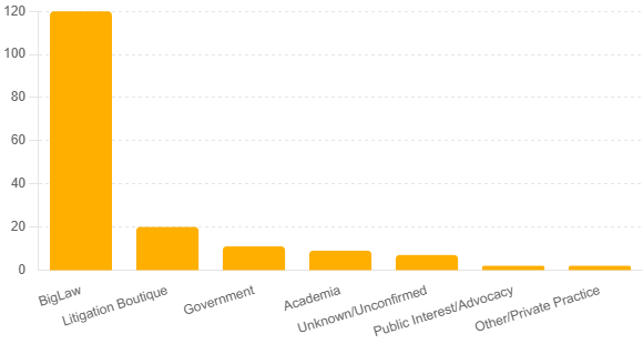 Looking at clerks from the 2019-20 to 2023-24 terms, Big Law accounts for 70% of placements, with litigation boutiques at 11%, government at 6%, and academia at 5%. A handful of firms dominate first jobs. Jones Day leads with 19% of placements, followed by Gibson Dunn and Kirkland & Ellis. Roughly one in five clerks starts at a single firm, and nearly half land at just three firms.
