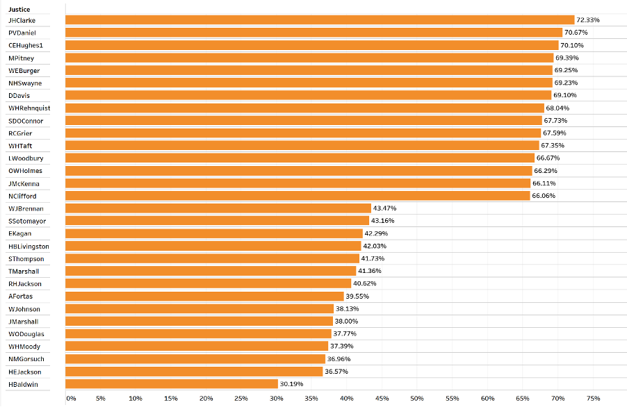Among the current justices, none appear in the top 15. At the bottom there is a mix of the court’s conservative and liberal wings. Justice Sonia Sotomayor, often viewed as part of the court’s liberal wing, voted for the government 43.16% of the time. This places her just a touch above fellow liberal Justice Elena Kagan, who voted in favor of the government 42.29% of the time and significantly ahead of Justice Neil Gorsuch, one of the more conservative justices, who supported the government’s position less than 37% of the time, perhaps in line with his libertarian instincts. (The average support for the government across all justices with 25 or more votes was 55.82%.)