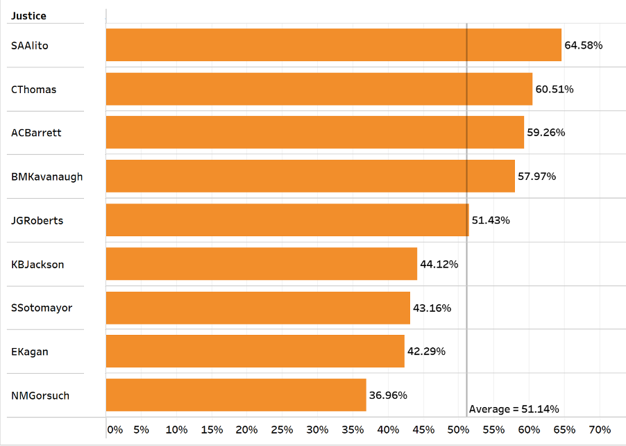 With the exception of Gorsuch, the conservative justices, led by Justice Samuel Alito, provide the highest support for the government. Roberts is right in the middle at 51.43%.