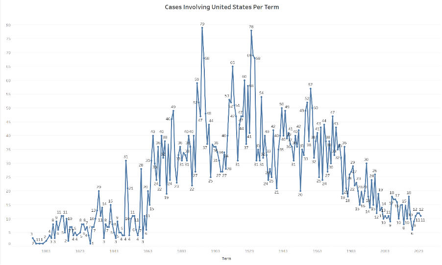 Figure 1, below, shows the number of cases involving the United States per term from 1803 through 2024. The pattern reveals dramatic growth through the early 20th century, peaking at 79 cases in the 1891 term during the court of Chief Justice Melville Fuller (1888-1910). This expansion reflected the growing reach of federal power and the court’s expanding docket. The mid-20th century saw continued high volumes, with the court of Chief Justice Earl Warren (1953-1969) often having over 40 such cases per term. Since the early 1980s, however, the overall number of cases has declined substantially as the court has reduced its total docket, although cases involving the United States remain a significant portion of the court’s work.