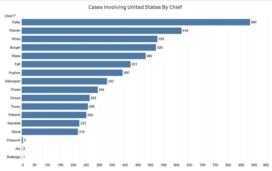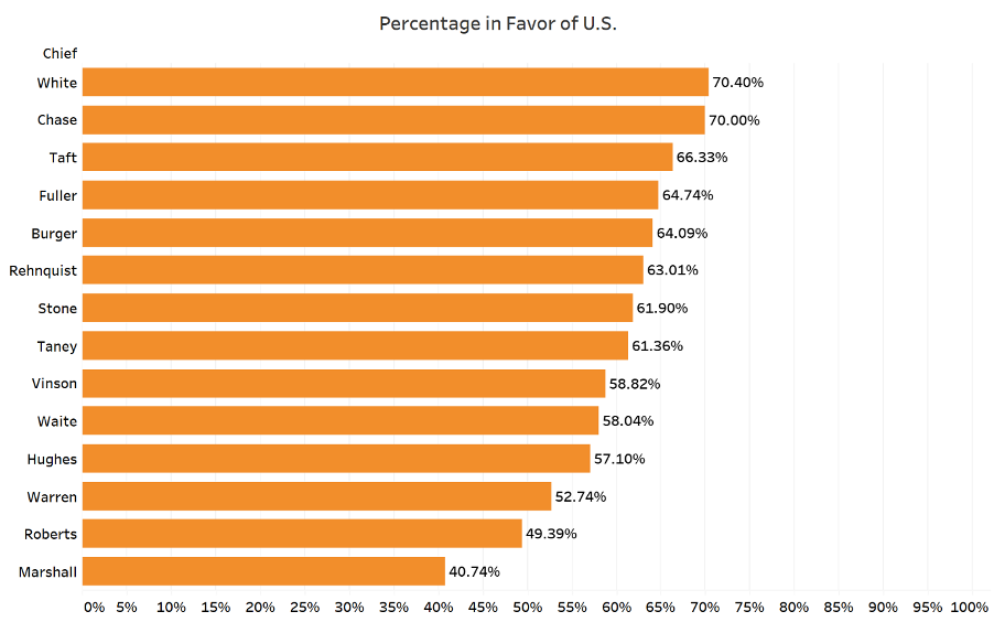 The next chart breaks down support for the United States by chief justice and the party of the president. The analysis is limited to chief justices since 1900 in order to focus on the modern era of more developed executive power.
