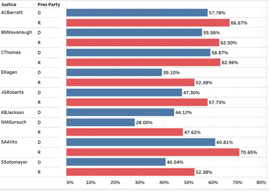 Finally, examining whether support is Trump-specific or party-specific requires additional work. The clustering of current justices around similar support rates suggests that partisan differences may be less pronounced than in earlier eras, but this could also reflect the types of cases reaching the court or the strength of legal arguments presented. Additionally, since the sample size for the current court composition is still relatively low, comparisons between this court and previous eras will become clearer as the justices work through more cases.