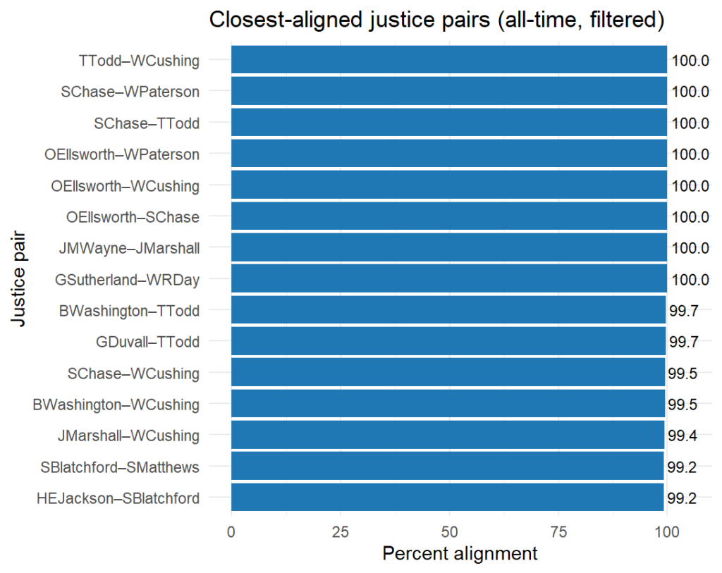 For those history buffs among us, we can also break down what specific justices agreed the most. As noted, early justices achieved near-perfect agreement, with some, such as Justices Thomas Todd and William Cushing, as well as Justices Samuel Chase and William Paterson, actually agreeing in every single case before them. These extraordinary rates reflect a smaller, more cohesive court operating within narrower jurisdictional bounds on what cases could and could not be heard.