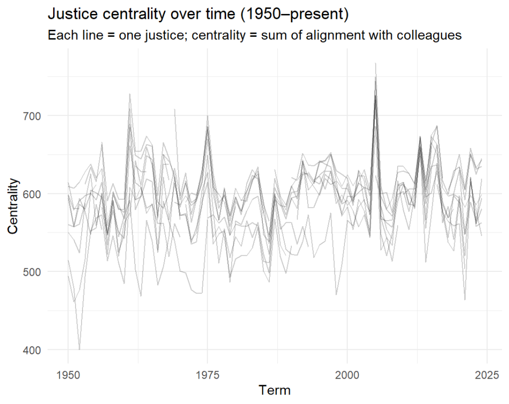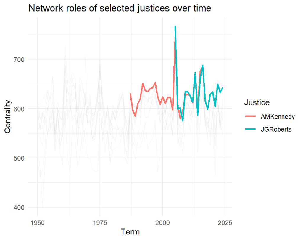 Chief Justice John Roberts tells a different story. His swing-votes spiked dramatically around 2006-08, even briefly exceeding Kennedy’s peak, reflecting his early institutionalist bridge-building (such as his vote in the Affordable Care Act case). However, this centrality has declined in recent years, settling into a range typical of more consistently conservative justices. Thus, since Kennedy’s retirement in 2018, no justice has really emerged as a true swing vote.