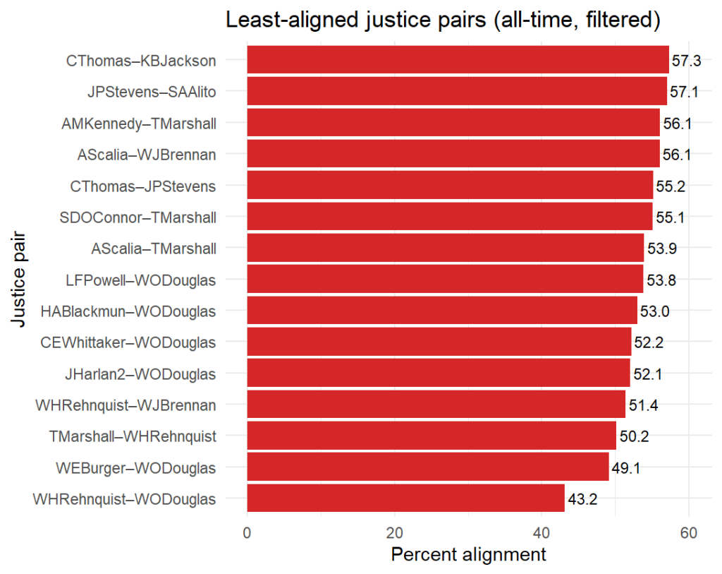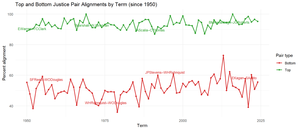 Another interesting pattern emerges by looking at this data: while top-pair agreements (justices agreeing with one another) have remained remarkably stable – in the 90-100% range across seven decades – bottom-pair agreements (justices disagreeing with one another) have fluctuated wildly. This shows a fundamental asymmetry: ideologically similar justices reliably vote together, but cross-ideological disagreements have varied in intensity.