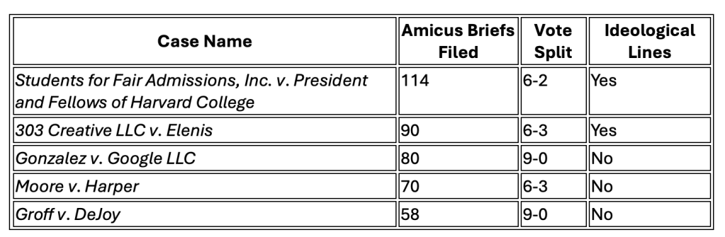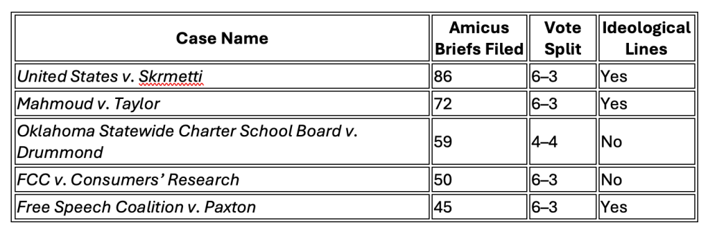 On a per term basis, United States v. Skrmetti (whether a state could ban certain medical treatments for transgender minors), City of Grants Pass v. Johnson, and Students for Fair Admissions v. Harvard College(whether affirmative action in college admissions violated the equal protection clause of the 14th Amendment) yielded the most amici.