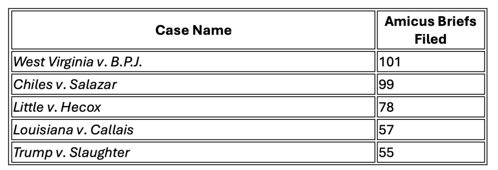 Perhaps the most prominent absence is Learning Resources, Inc. v. Trump, the challenge to Trump’s power to levy tariffs under the International Emergency Economic Powers Act, which just barely missed the top five with 47 briefs. But like CASA, Learning Resources was an expedited case that gave reduced time to file amicus briefs.