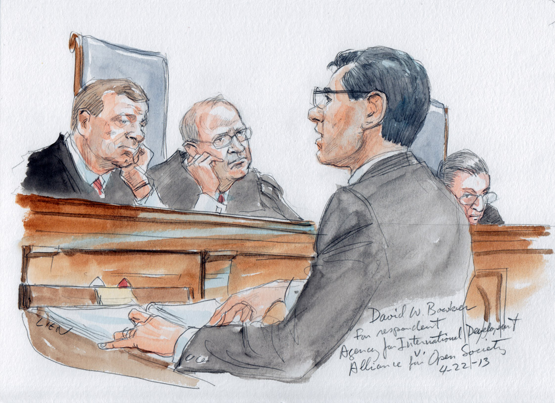 No matter how two lawyers tried to simplify their arguments before the Supreme Court on Monday, the Justices often acted as if there just had to be a way to reduce them down even more. The Court seemed to be grasping for a way to understand more clearly the two stark alternatives it was being offered in the case of Agency for International Development v. Alliance for Open Society (12-10).