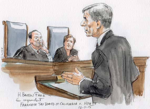 The lawyer for the taxpayer who had sued the California agency in Nevada court — Washington attorney Bartow H. Farr — opened his side of the argument by urging the Court to leave the Nevada v. Hall precedent intact. Picking up on the line of argument that the liberal Justices had been pursuing, he contended that the Constitution as it has existed allows the states sufficient opportunity to rely upon “the ordinary political processes” to make a compact to respect each other’s “absolute immunity” without having the Supreme Court create it for them.