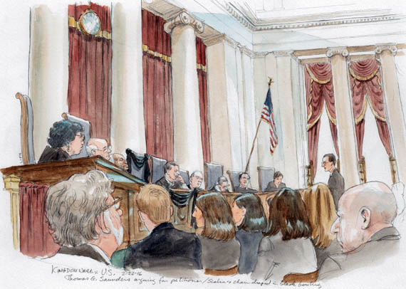 Thomas G. Saunders arguing for petitioner. Note black bunting on bench and Scalia’s chair. (Art Lien)