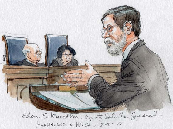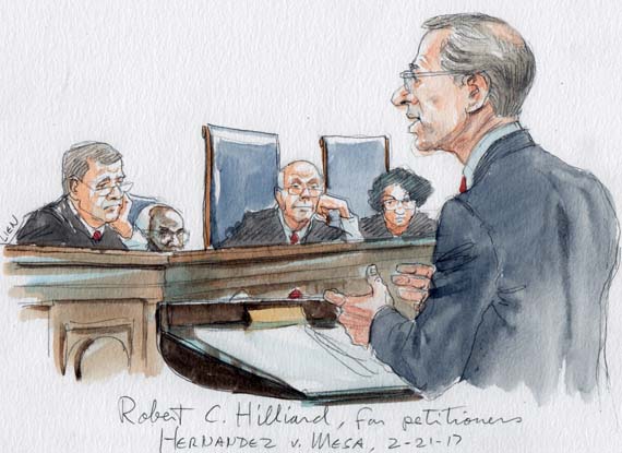 Representing the parents of Sergio Hernández, who contend that their son was playing in the culvert along the U.S.-Mexico border when he was shot, on the Mexican side of the border, by Jesus Mesa, a Border Patrol agent who was on the U.S. side, attorney Robert Hilliard argued that the dispute now before the court was “one of the simplest” cases involving the application of U.S. law outside the United States. Mesa, a civilian law enforcement officer, fired the bullet in the United States, striking Hernández, also a civilian, and depriving Hernández of his fundamental right to life. For that reason, Hilliard argued, the Fourth Amendment’s bar on the unjustified use of deadly force applied to Hernández, even if he was outside the United States when the shooting occurred.