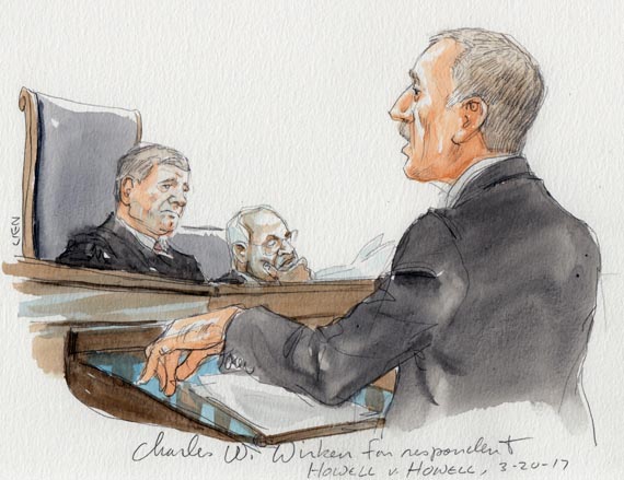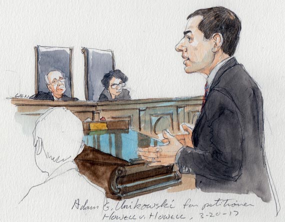 We often refer to the Supreme Court as a “hot bench”: Questions fly fast and furious from all the justices, often allowing the lawyers to get out only a few sentences (if that many) before fielding the next question. However, the bench that heard today’s oral argument in Howell v. Howell, a dispute over military retirement pay in a divorce, was more lukewarm than hot. Advocates for both sides had plenty of extended opportunities to speak – so much so that Adam Unikowsky, representing petitioner John Howell, only used a little more than half of his allotted 30 minutes during the main part of his argument. The relatively sparse questioning from the justices was no doubt welcomed by the advocates, but it made it much harder to predict how the justices might ultimately resolve the case.