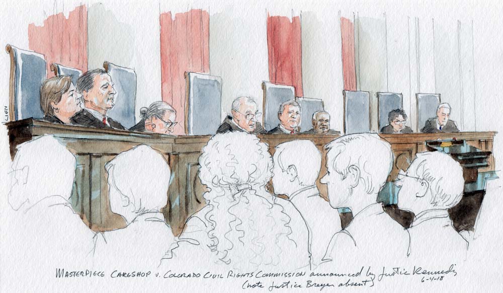 The chief justice then says that Kennedy has the opinion in Masterpiece Cakeshop Ltd. v. Colorado Civil Rights Commission. It seems that everyone in the courtroom, from Harvard Law alumni to everyday tourists, recognizes this case caption and shifts in their seats a bit.