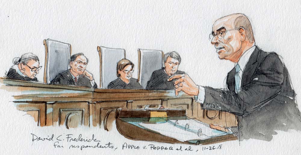 Frederick acknowledged that he wasn’t certain, but he used his answer to make two more points that may help to seal a win in his favor. First, Congress created the triple-damages remedy to deter antitrust violations “just like this one.” Second, he added, Apple cannot point to another e-commerce distributor that operates this way, which may give the justices some comfort that their ruling will not open the floodgates to similar e-commerce lawsuits.
