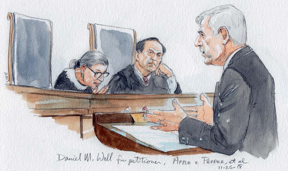 Arguing for Apple, lawyer Daniel Wall told the justices that the iPhone users’ claim is exactly the kind of claim that is prohibited under the Supreme Court’s 1977 decision in Illinois Brick Co. v. Illinois, which held that only consumers who are direct purchasers of a product can bring a lawsuit seeking the triple damages available for violations of federal antitrust laws: Here, Wall said, the only theory of damages in the case is that Apple charges app developers a 30-percent commission, which in turn causes the developers to increase the prices that consumers pay for apps. Therefore, Wall argued, it is the app developers, not the iPhone users, who are direct purchasers under Illinois Brick.