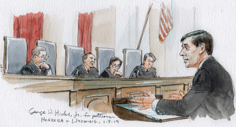 The argument began with George Hicks, counsel for the petitioner, Clayvin Herrera, confronting questions about why the U.S. Court of Appeals for the 10th Circuit’s 1995 decision Crow Tribe v. Repsis, which found that the Crow’s treaty right had been abrogated, did not bar Herrera from relitigating the treaty issue. In a discussion that Justice Samuel Alito likened to law school, the justices pressed Hicks on the effect for future litigation of decisions like Repsis that reached multiple, alternative holdings. But when John Knepper, counsel for Wyoming, rose, the justices had pointed questions on this topic for him, too, particularly about his insistence that Mille Lacs (which undermined the doctrinal foundation for Repsis) was not a significant enough change in the legal context to warrant an exception to the normal preclusion rules. When asked what the test for such a change would be, Knepper offered up a “a major doctrinal shift.”
