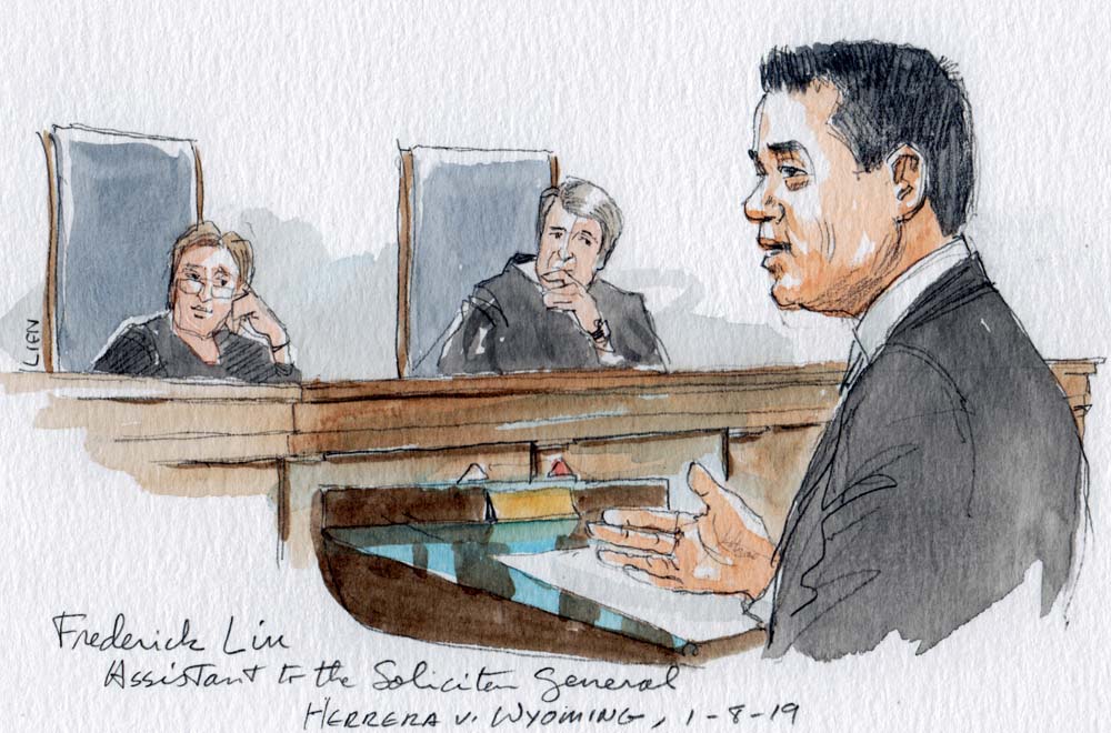 In fact, much of the argument focused on the puzzle of what, exactly, the Supreme Court had done in Mille Lacs, and how large a shift the case represented. In the 1999 decision, the court effectively repudiated a century-old ruling called Ward v. Race Horse that statehood could abrogate Indian treaty rights, yet the court stopped short of explicitly overruling Race Horse. Justice Brett Kavanaugh pushed Hicks, Herrera’s attorney, on the seeming anomaly that this situation might create. The Crow treaty contained the “exact same treaty language” as the Shoshone-Bannock treaty at issue in Race Horse, but, if the Supreme Court found for Herrera, the Crow would enjoy their treaty right while the Shoshone-Bannock would still be bound by Race Horse. Hicks pointed to historical distinctions between the situation of the two tribes. Confronted with the same question, Frederick Liu, arguing for the federal government in support of Herrera, invited the court to expressly overrule Race Horse.