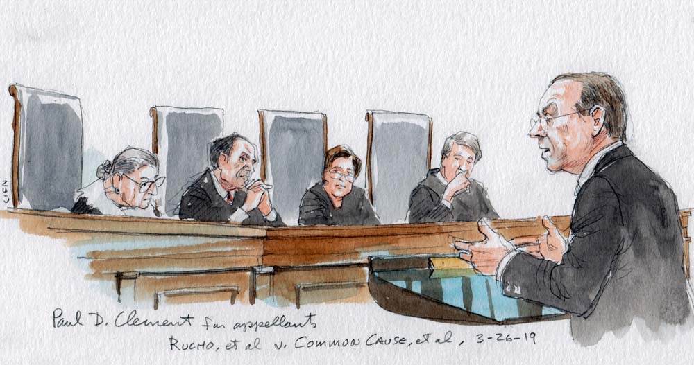 During the oral arguments in last term’s partisan-gerrymandering cases, Roberts was deeply concerned about the effect on the Supreme Court’s institutional reputation if it were to get involved in partisan-gerrymandering cases. Although Roberts may not have voiced those worries today, Clement clearly tried to evoke them. Even if the court’s four more liberal justices are all in favor of the court’s getting involved in partisan-gerrymandering cases, they would need to pick up one more vote – in all likelihood, from either Kavanaugh or Roberts – but it’s not clear after today’s argument whether they can enlist at least one of those justices.