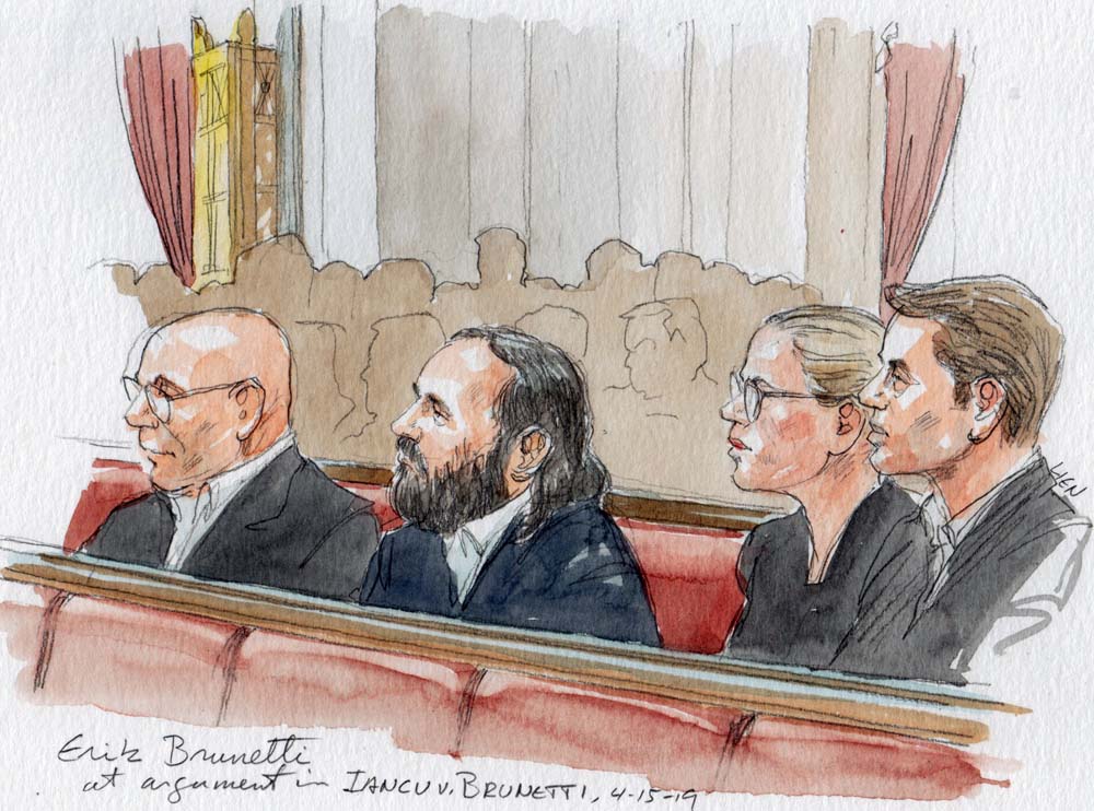 As the argument in Brunetti gets going, there is a derby of sorts among the justices and the lawyers for creative ways to avoid mentioning the trademark at issue in the case. (I’m generally using “Brunetti’s mark” as my polite substitute.)