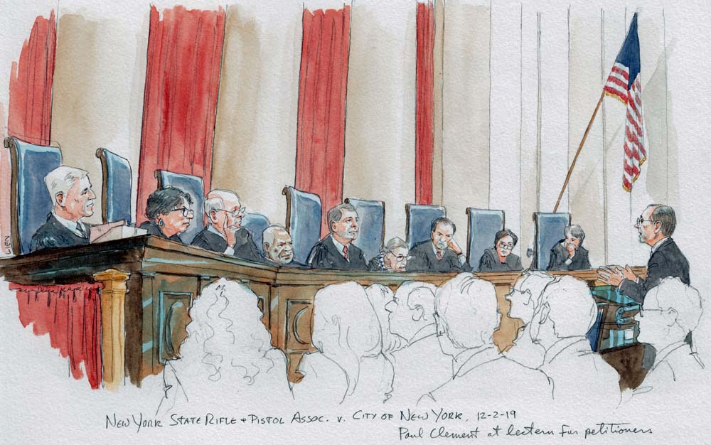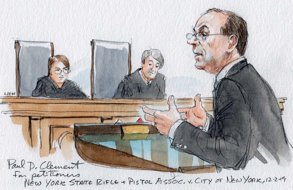 Arguing on behalf of the gun owners, former U.S. solicitor general Paul Clement told the justices that the text and history of the Second Amendment make clear that the city’s transport ban was unconstitutional. Complaining that the city has “struggled mightily to make this case go away,” Clement spent much of his time at the lectern fielding questions about whether the court should decide the Second Amendment question at all.