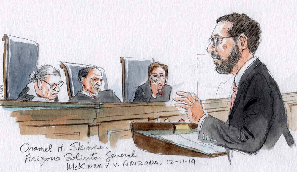 Arguing for the state, Arizona Solicitor General Oramel Skinner faced questions, mostly from the court’s more liberal justices, about why – despite the state’s representations to the contrary – the resentencing proceeding after the 9th Circuit’s ruling didn’t reopen McKinney’s case on direct review, so that he would be entitled to have a jury resentence him. Justice Ruth Bader Ginsburg asked Skinner how, if the Arizona Supreme Court had made a mistake in the original proceeding, that mistake could be fixed without a “do-over”? There’s nothing “collateral” about it, Ginsburg said.