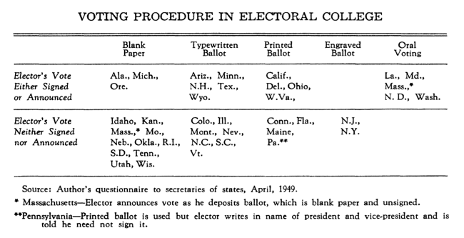 Accountability. One might expect, were it a deliberate course of practice to deny electors discretion, that states would universally hold electors accountable for cast votes. But evidence suggests that states have not always done so. In 2004, for example, an elector defected in Minnesota, but no one knew who it was because balloting had been conducted in secret. It appears that no comprehensive study has been undertaken to determine the extent to which electors have historically been held accountable for their vote. One historian, writing in 1949, collected evidence suggesting that quite a few states did not require electors to sign their ballot or otherwise be held to account (see row of states in which the “Elector’s Vote [is] Neither Signed nor Announced”):