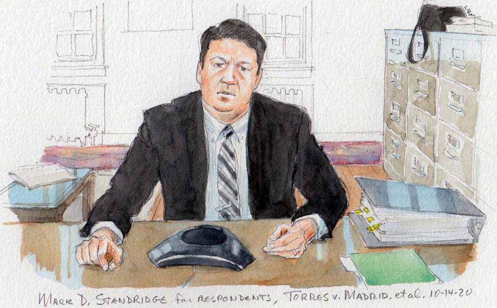 Kelsi Corkran argued on behalf of Roxanne Torres, a New Mexico woman who was shot twice by state police before driving away from the scene. She had support from Rebecca Taibleson, who appeared as a “friend of the court” on behalf of the United States. Mark Standridge argued for the police officers, Janice Madrid and Richard Williamson. Torres claims in a civil rights lawsuit that the officers violated her Fourth Amendment right by committing an unreasonable seizure when they shot her. The officers’ defense is that the shooting did not constitute a seizure at all.