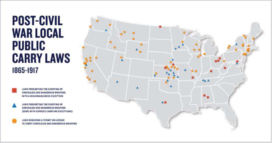Nor were these restrictive public-carry regimes an exclusively western development. In 1873, Jersey City prohibited carrying dangerous weapons without a permit, which the city’s municipal court could grant to people “from the nature of their profession, business or occupation, or from peculiar circumstances.” Jersey City was hardly one of the “cattle towns” of the Old West, another body of evidence that Thomas simply discounts because it is inconsistent with his ideological agenda. The map below graphically underscores how wrong Thomas got the history in Bruen. It shows that millions of Americans were living under restrictive public-carry laws similar in scope to the New York law at issue in Bruen for decades before the Sullivan Act.